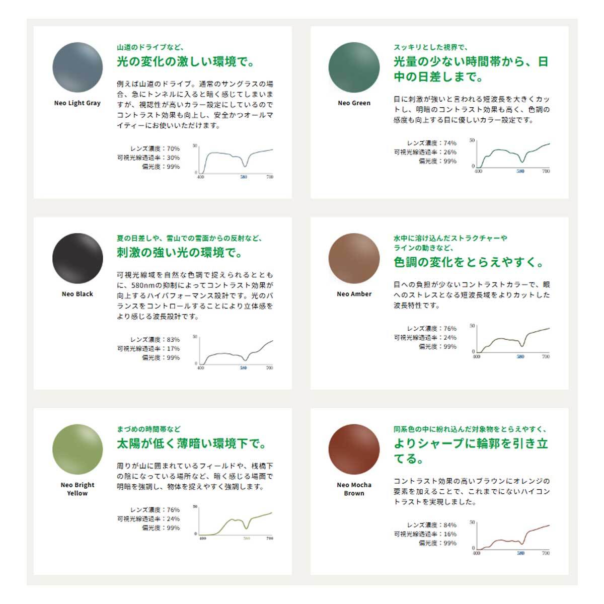 独自の2層フィルター構造により、人気コントラストレンズ「ネオコントラスト」の鮮明な視覚強調機能と、UV420までカットする「コンプリート」保護を融合。高コントラストと完全UV防御を両立させ、日常からスポーツまで高次元の視認性を発揮します。