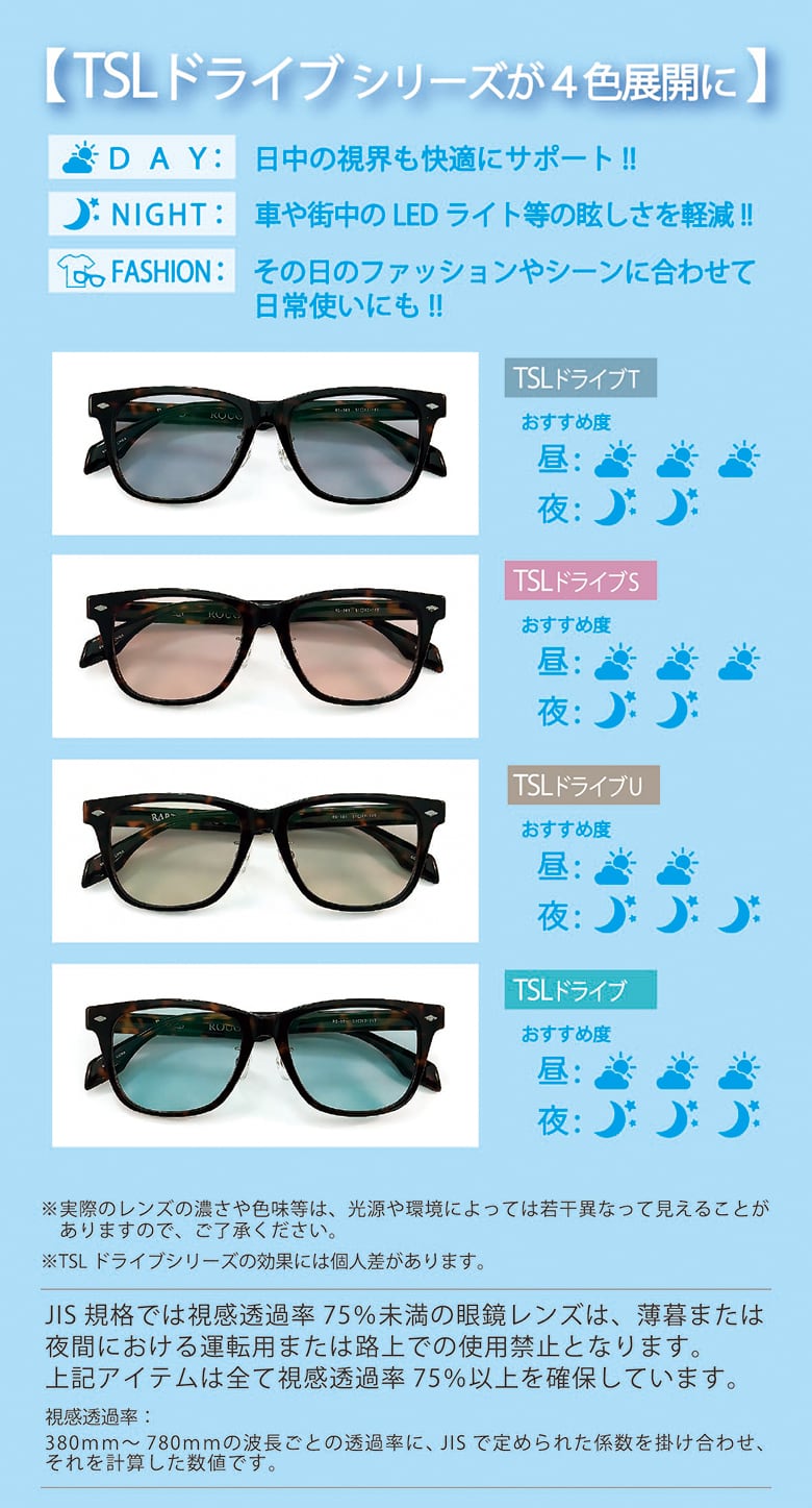 TSLドライブとTSLドライブuは、夜間運転時の眩しさを軽減するために設計された高性能レンズです。TSLドライブは、青と緑を混ぜた独特の色合いで、ヘッドライトやテールランプの眩しさを低減します。視感透過率は約80%で、JIS規格に適合しており、夜間運転にも使用可能です。